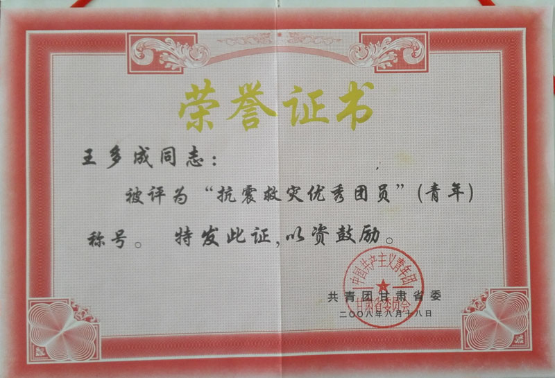 | 2008年榮獲抗震救災(zāi)優(yōu)秀青年稱號榮譽(yù)證書 | ||
